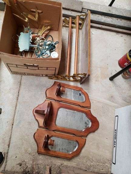 LOT 1074 - Homemade mirror with candle holder, towel rack, misc decor