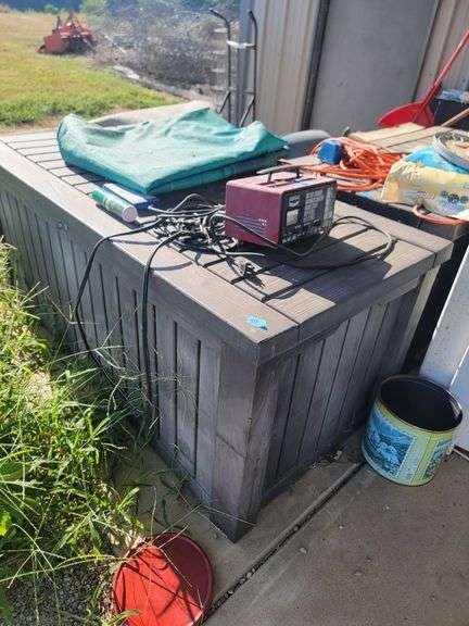 LOT 411 - Brown outdoor storage and contents inside , outside items are not included