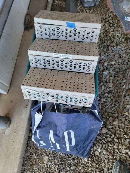 LOT 423 - Green tote with contents watering can, hummingbird feeder, dog steps