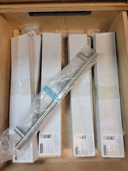 Eight new cabinet pulls from Amerock, each measuring 12 inches in length. The pulls are made of sterling nickel, with model number BP5400BCSG9. All pieces are in their original packaging, ensuring they remain unused and in excellent condition. Ideal for cabinetry upgrades or replacements.