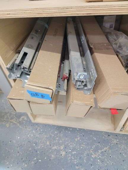 Multiple drawer slides made of durable metal, stored in original packaging. Items are in varying conditions but appear suitable for usage in carpentry or furniture repair. No manufacturer or size details are specified. Additional hardware, potentially related to the drawer slides, is included in the lot.
