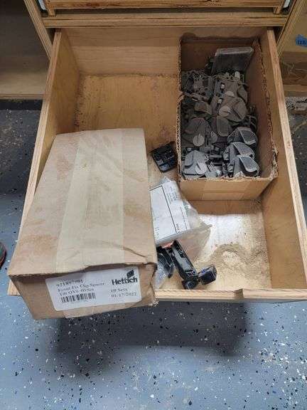 An assortment of cabinet hardware, featuring hinges, brackets, and installation components. The items appear to include branded pieces from Hettich and other manufacturers, some still in original packaging. Items are housed in a wooden drawer, which has light sawdust indicating prior storage in a workshop environment. Condition of items and quantities vary.