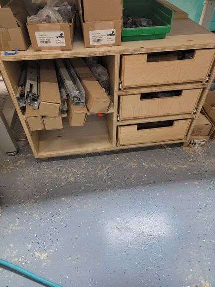 Wooden cabinet featuring three drawers and open shelving. The structure is constructed from wood and is designed for utility purposes, housing removable drawers and open spaces for storage. The cabinet is sold without contents. Some visible wear and signs of use are present.