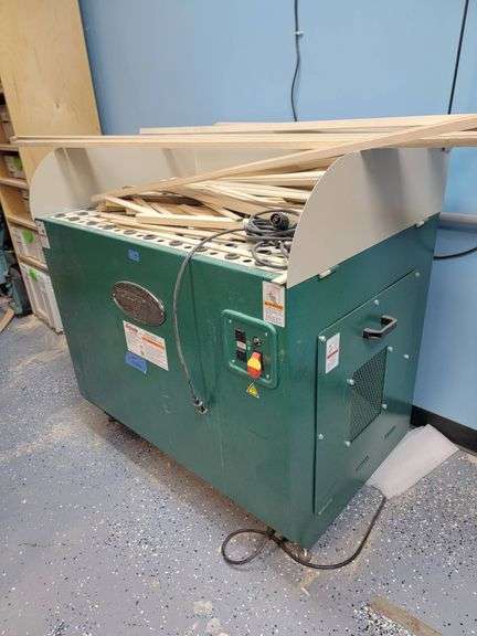 Grizzly model H2936 down draft table designed for woodworking applications. Features a durable steel construction with a green finish and built-in controls. Machine has been used and may exhibit signs of wear.
