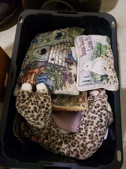 LOT 285 - Tote with throw pillows, table cloths neck pillow